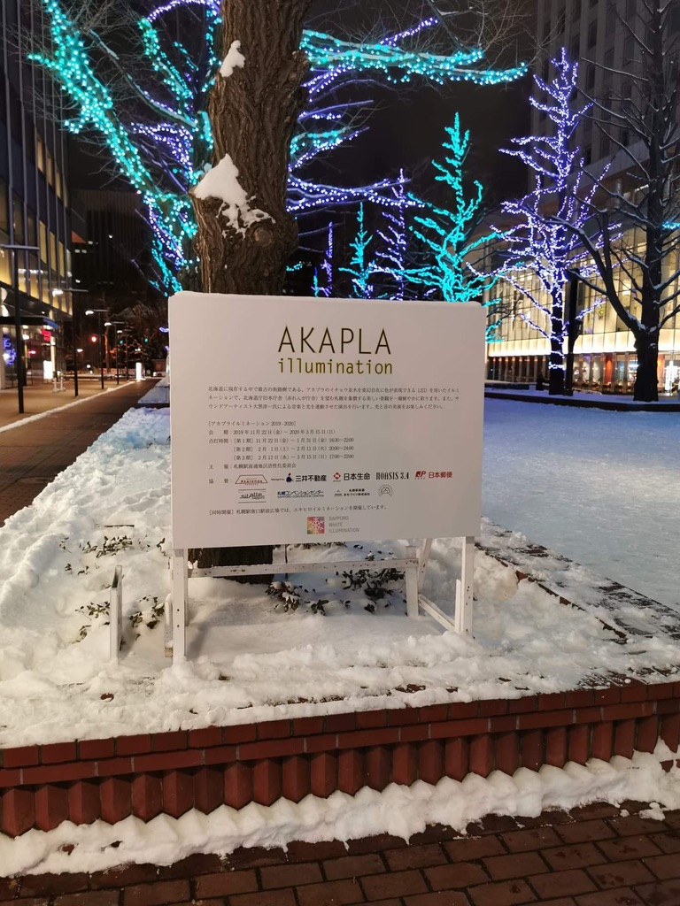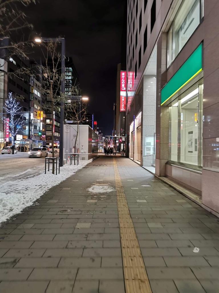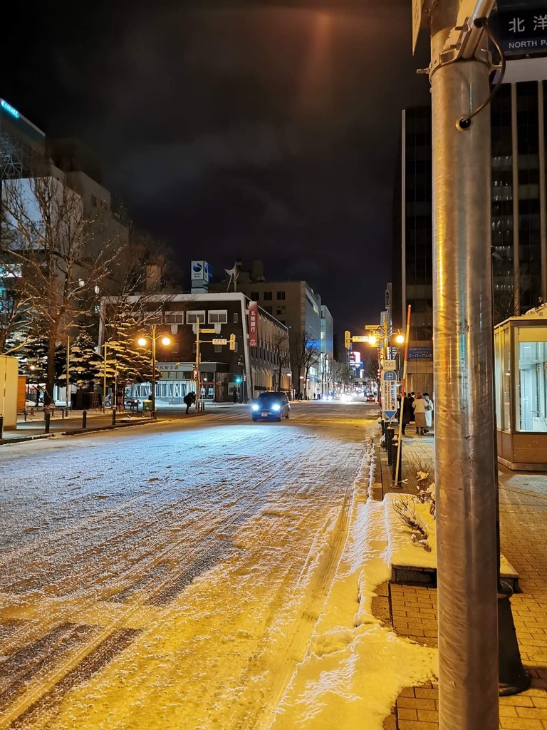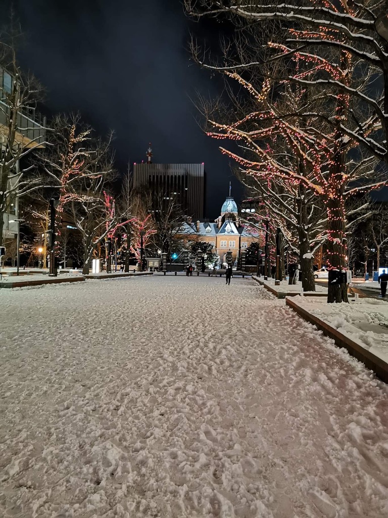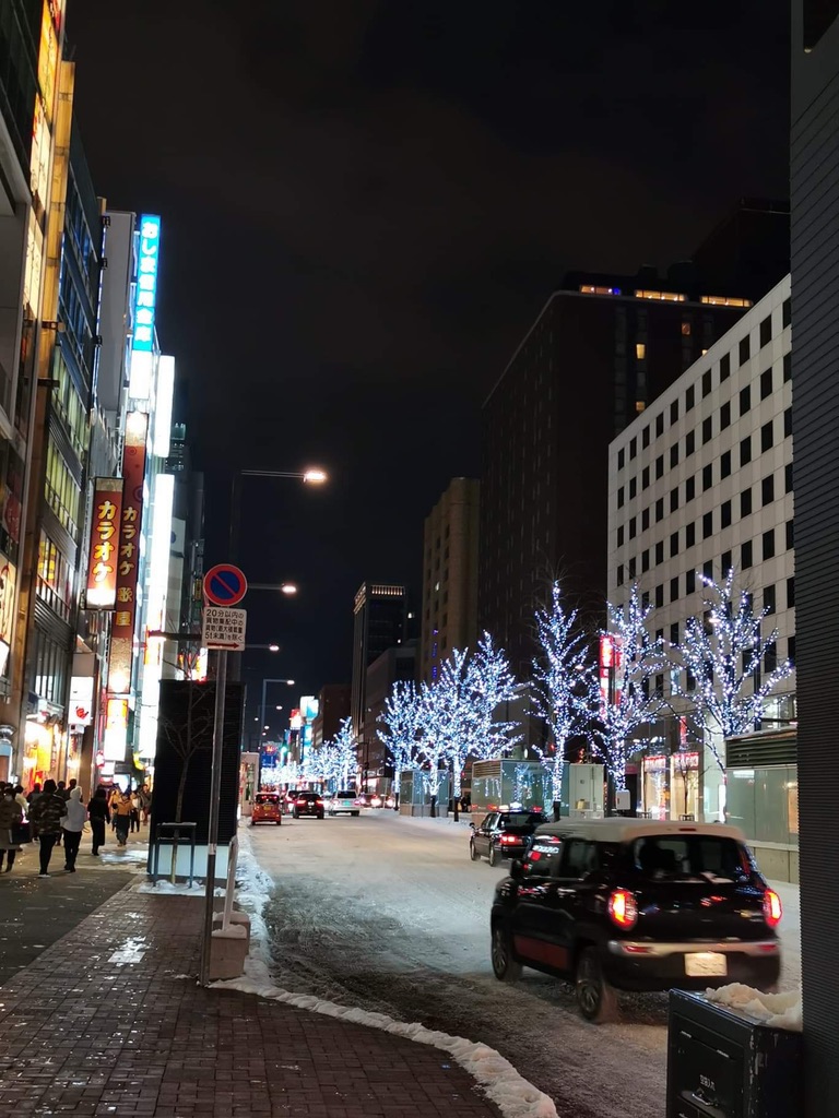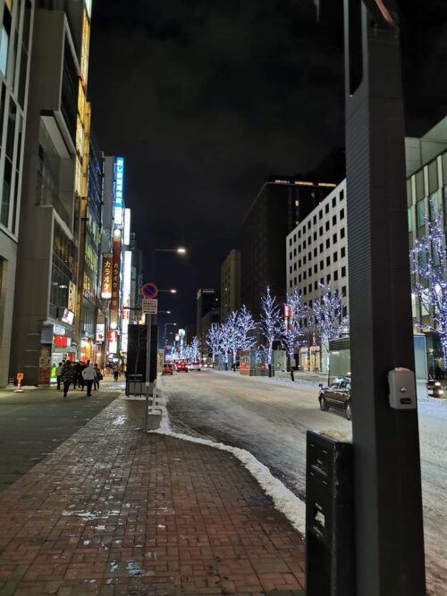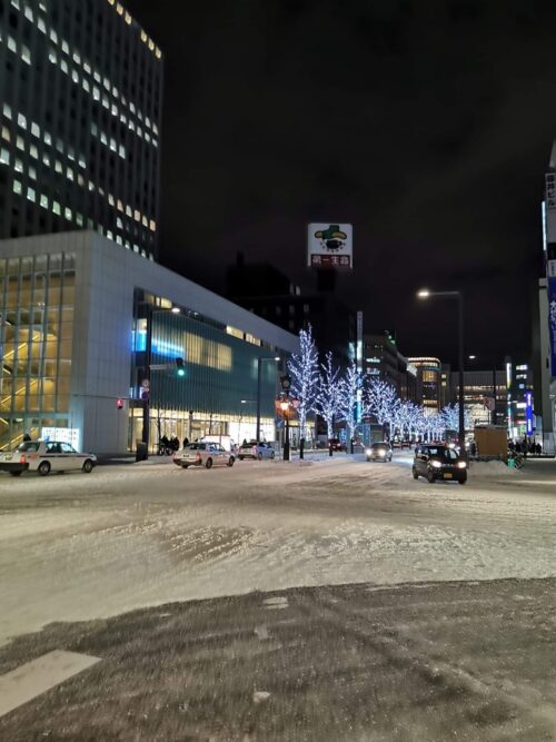 Sapporo at night feels like a dream — streets lined with silver frost,